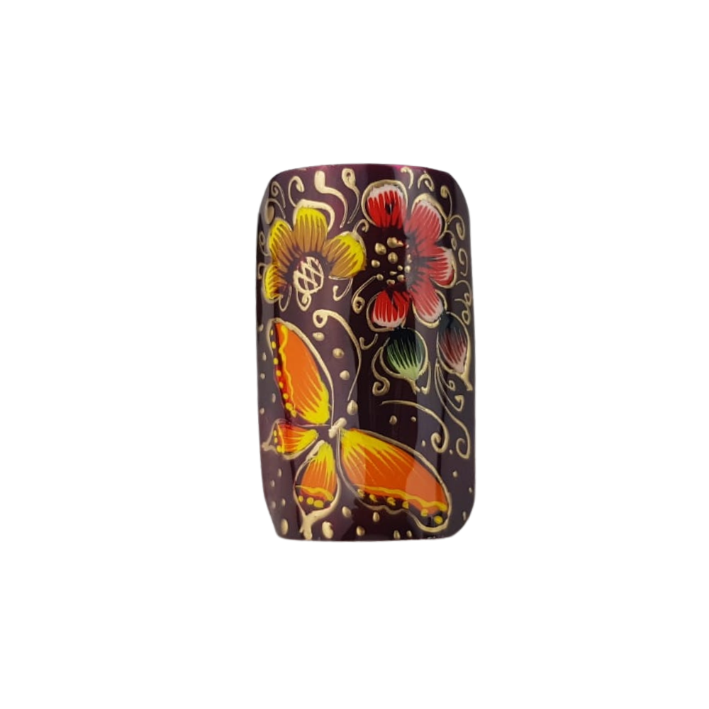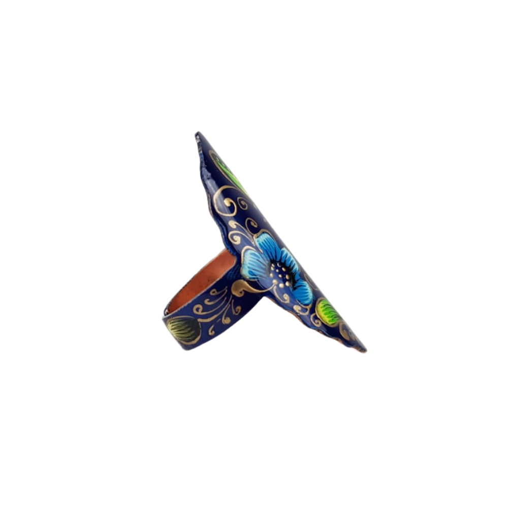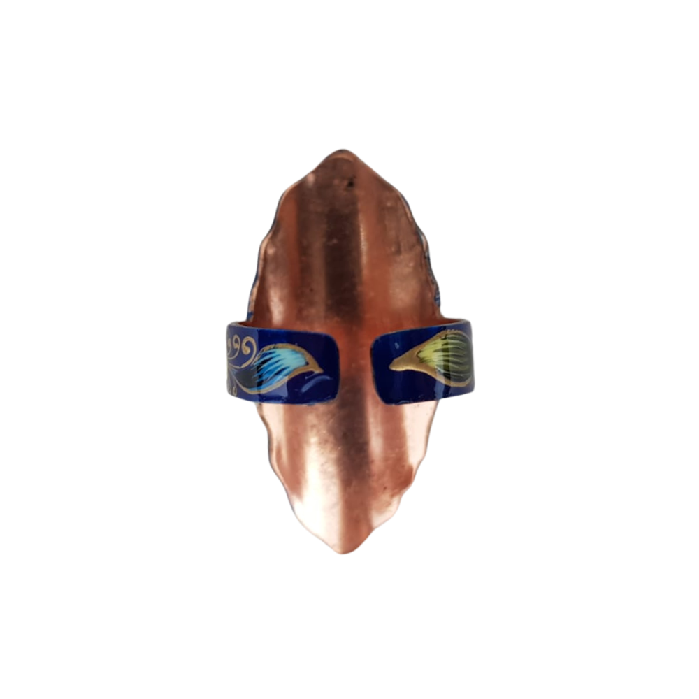 Anillo hecho en cobre, decorado con la técnica de laca perfilada con mariposas y flores. Artesanía de Pátzcuaro, Michoacán, elaborada por Víctor Gaona.