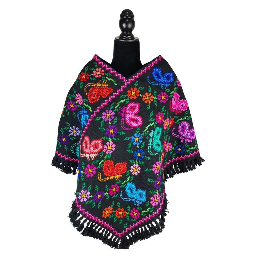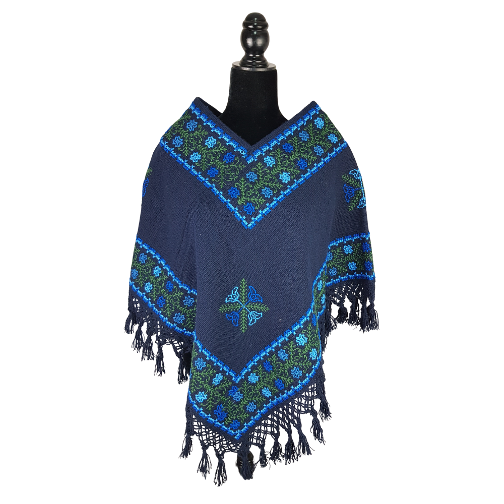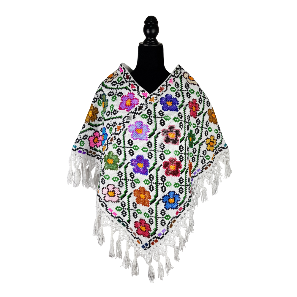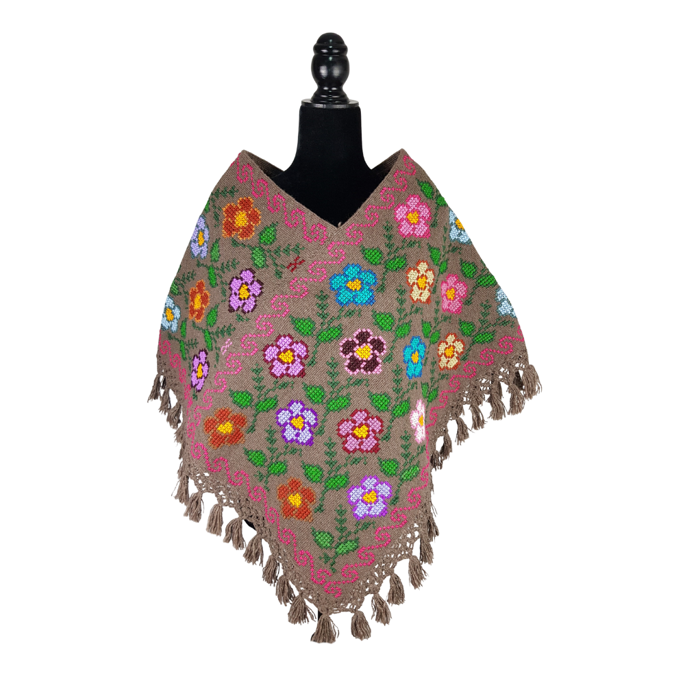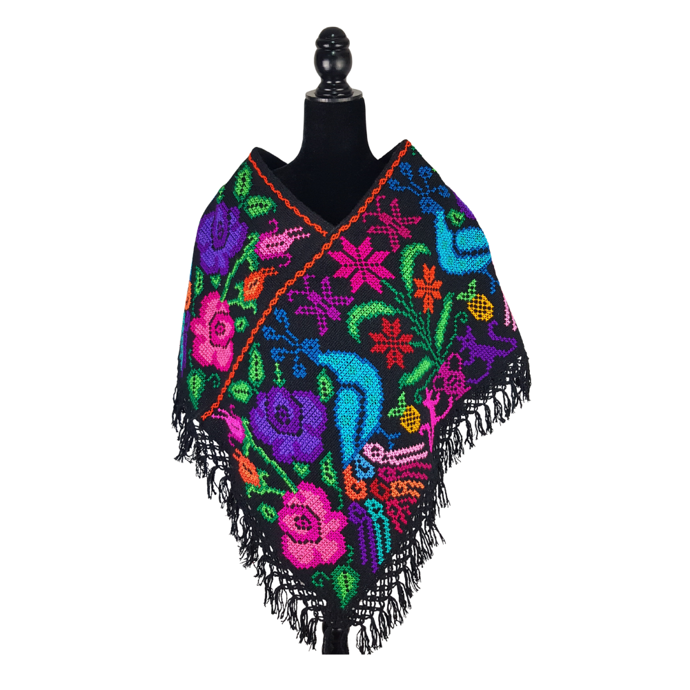 Quexquémetl, capita mediana de acrilán con bordado en punto de cruz o puntada antigua