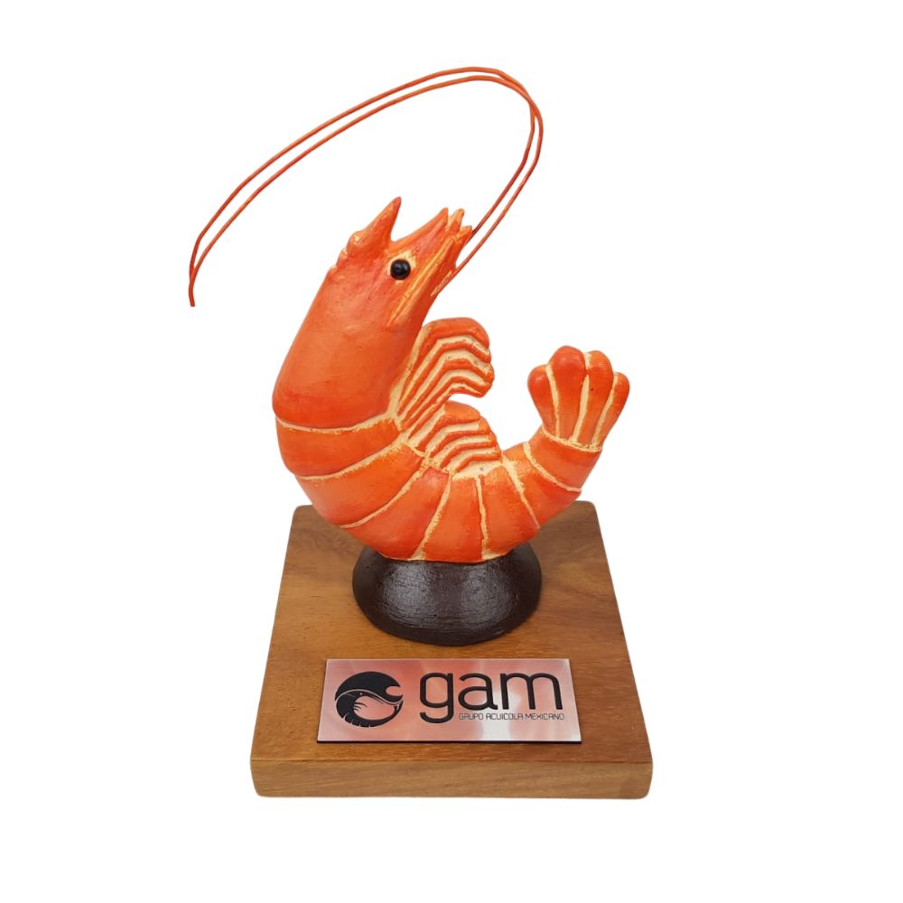 Reconocimiento con artesanía mexicana. Camarón de barro en trofeo con base de madera y placa metálica personalizada