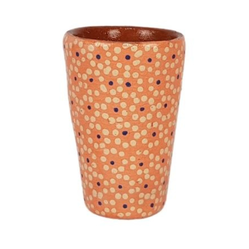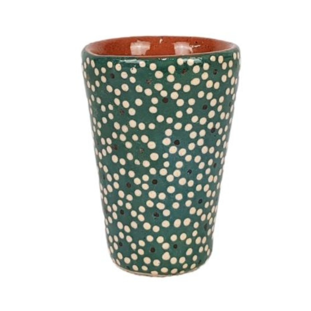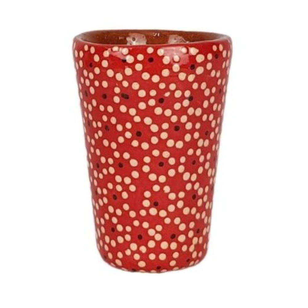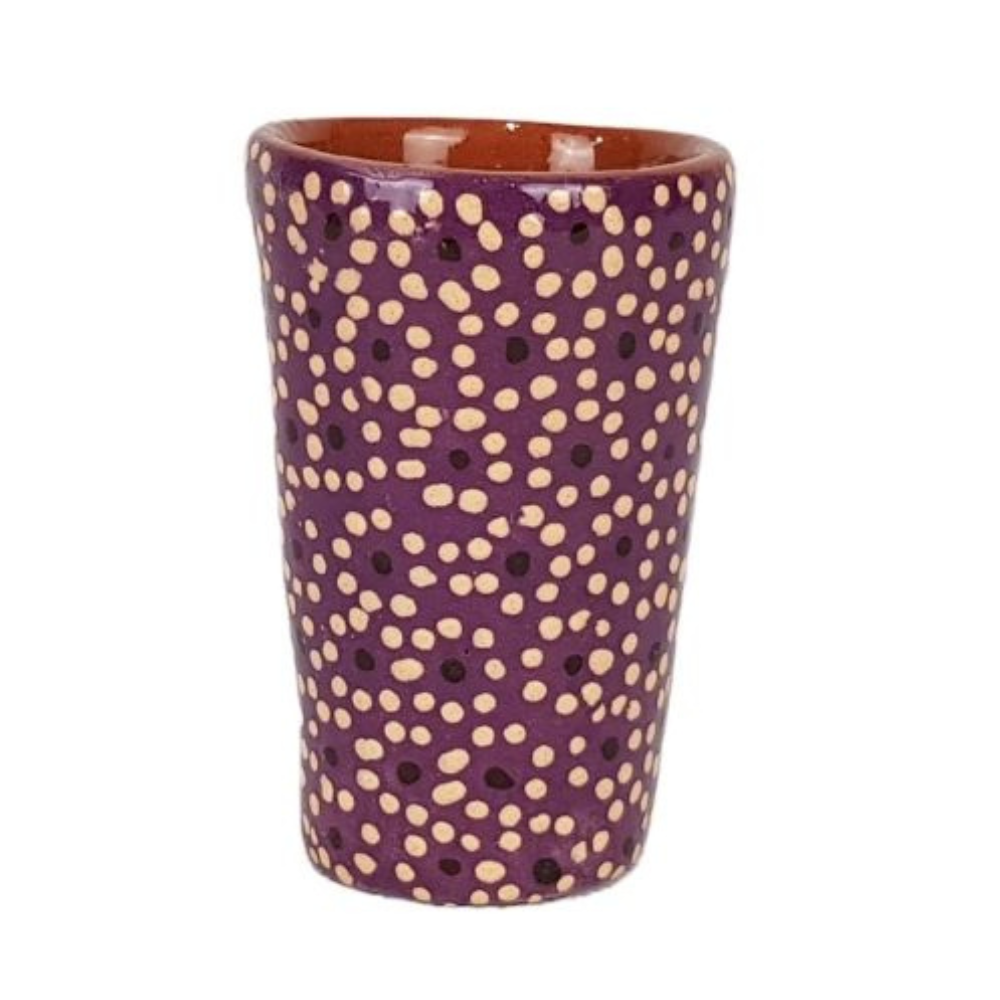 Colorido tequilero elaborado en barro capulineado por María Inés, esta artesanía mexicana fue moldeada con molde y decorada a mano con la flor de capulín. Este característico estilo de decoración, le da el nombre de barro capulineado a la técnica empleada para la creación de estas bellas artesanías de Michoacán.