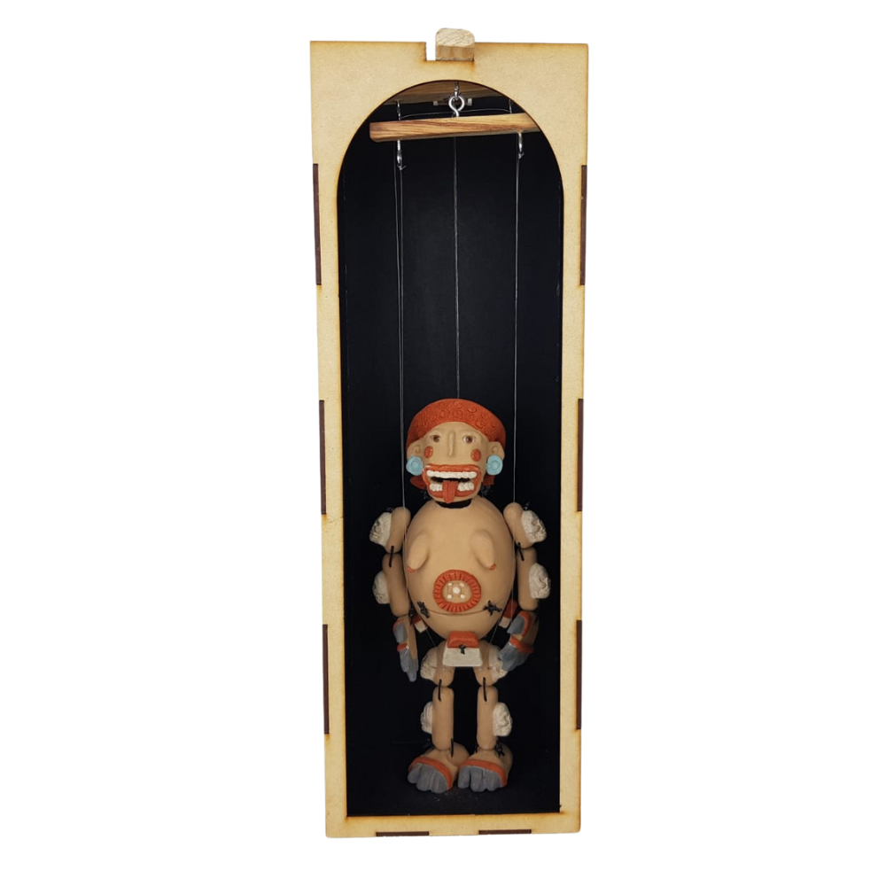 Títere de barro pintado con engobes naturales, con forma de la deidad prehispánica Tlaltecuhtli, diosa de la tierra.