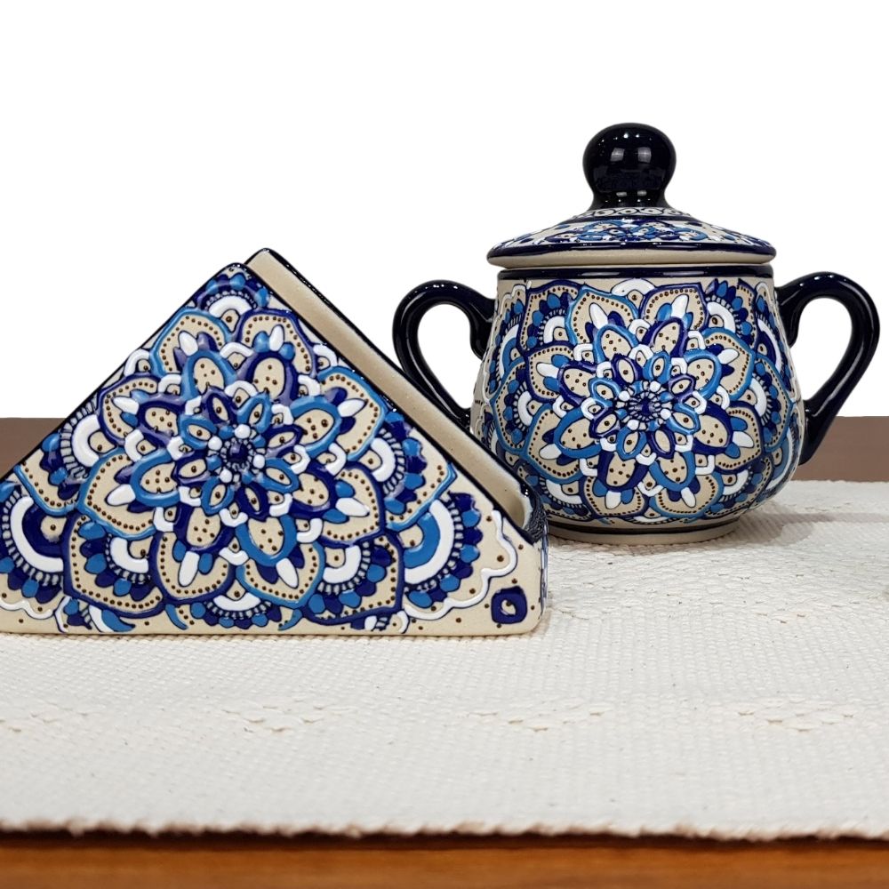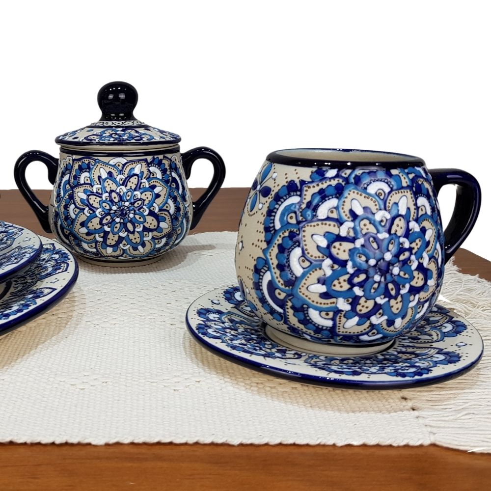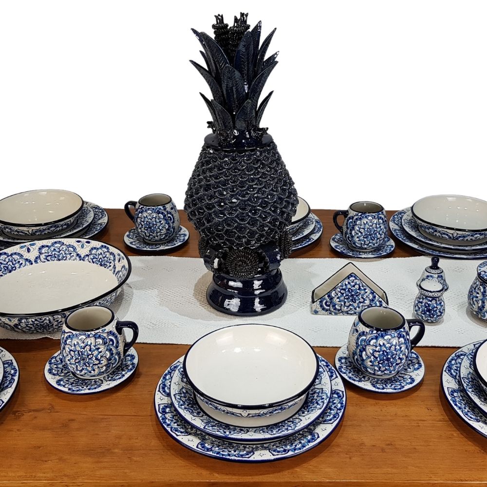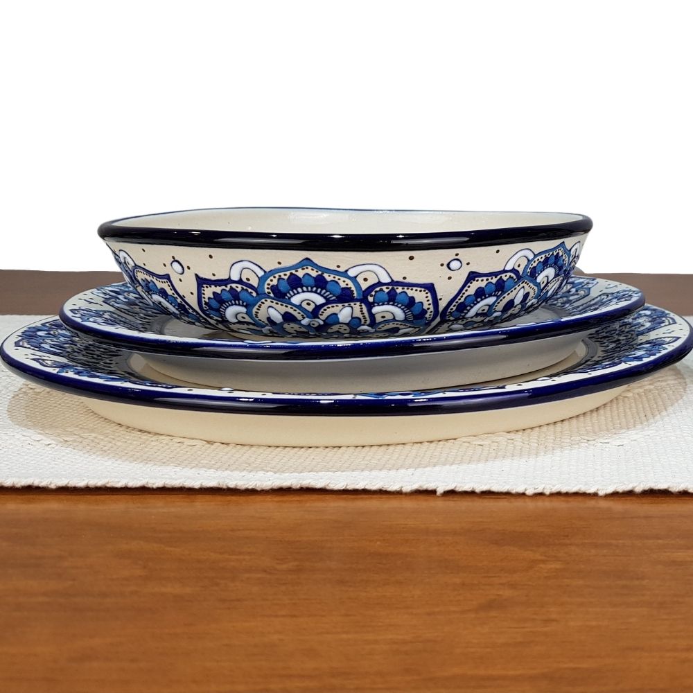Vajilla mandala color azul para 8 y 4 personas, cerámica de alta temperatura