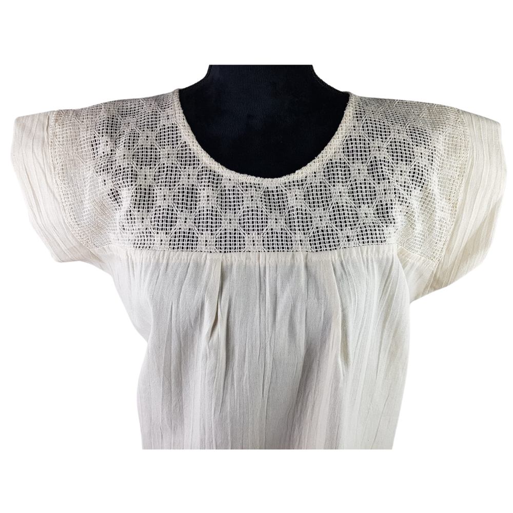 Vestido ligero de manta, confeccionado a mano en Mitla, Oaxaca, elaborado por artesanos de la zona.